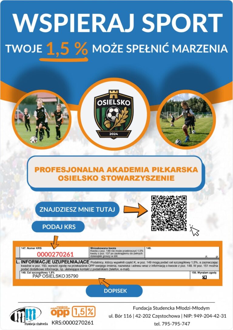 Zwracamy się do Was z ogromną prośbą o wsparcie naszej lokalnej inicjatywy sportowej – PAP OSIELSKO. Każdego dnia staramy się tworzyć miejsce, w którym dzieci i młodzież mogą rozwijać swoją pasję do sportu, uczyć się współpracy, wytrwałości i zdrowej rywalizacji. To nie tylko treningi piłkarskie – to budowanie charakteru, przyjaźni i poczucia wspólnoty.